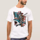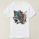 This white t-shirt features a unique and humourous design of a skeleton wearing a patriotic Uncle Sam-style hat and fishing while riding a shark. The American flag is prominently displayed in the background, blending a love for fishing with national pride.