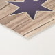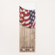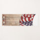 One side of this yoga mat features US patriotic bunting in red and white stripes plus a blue field with white stars draped over a wooden slat background. The bottom features a row of red, white, and blue stars. Fill in the personalize template field with your information, remove it or click customize to select a typeface style, size, and colour you like.