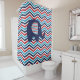 A patriotic USA red, white, blue, and navy blue shower curtain featuring an elephant of navy blue with chevron striped ears on a background of chevron stripes.