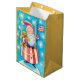 This Holiday gift bag features a wonderful vintage image of a Santa Claus who is dressed in a red, white, and blue robe. He is holding a Stars and Stripes USA flag in one hand, and a teddy bear with a red bow in the other. Behind him is a pretty blue star spangled sky. The sides of the bag are bright gold. Both sides of the bag have the same image. For hundreds of vintage and contemporary Christmas images on a variety of products, check out the "Christmas" section in our store.