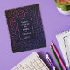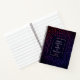 This notebook design features a pattern of lines coloured various pastel colours, with navy blue background. It also features a customized name and text.