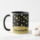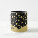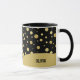 A chic mug for the fashion-conscious, this design features a gold polka dot pattern over a contrasting black background. Simply edit the sample text with your text or name on the other side.