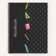 This cute notebook features a grey polka dot pattern on a black background with coloured school supplies. Personalize it with text and in matching pink on it.