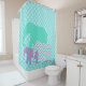 Shower curtain featuring three elephants in in purple, turquoise, and white with chevron stripes and polka dots on an aqua blue polka dotted background.