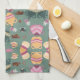 Patterned fabric featuring colorful teapots, cups, kitchen towel