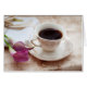 Coupe remplie de café assise sur une soucoupe aux lys de cala roses et serviettes en tissu