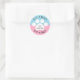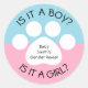 These round stickers display a white paw print on a blue and pink background and the text "Is it a boy? Is it a girl?" These stickers are great for paw print themed, dog themed, cat themed, or animal themed gender reveal parties.