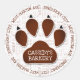 Woof word art in the background sets off the big dog paw print with your business name and your location or message circling around the edge. These stickers are perfect for pet bakeries, and boutiques to close gift bags, packages, etc. This one is in rich shades of brown with white and black accents, other colours also available.