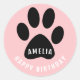 Paw Print Pink Happy Birthday Sticker with Name. The sticker features a black dog paw print with a name and a Happy birthday text on a pink background. Personalize the name with yours. Great as a gift wrapping sticker or mailing accessory for a girl or a boy who celebrates a birthday.