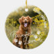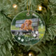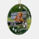 Dog memorial ornament printed with a photo of your beloved dog, one on either side. Add your dog's name and years living in a curved modern text. Forever loved at the bottom of the dog photo ornament adorned with little dog paw prints. Honour your dog who's passed away with this pet memorial forever loved ornament personalized with photos of your dog and their name, year of birth, and year of passing.
