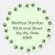 Address labels with a round border of black dog or cat paw prints on a pale green background. Customize with your name and contact information and use them as return address labels on the back of envelopes or on gift packages. Or stick them in books or on other belongings to identify them as yours. Available in other colours.