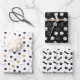Mixed dog themed patterned wrapping paper sheets with three different but matching dog patterns with paw prints, dog bones, and balls in black and white seamless patterns. Great for pet birthdays or pet Christmas gifts!