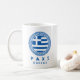 Paxi, Greece coffee mug featuring the national flag of Greece inside a Greek key pattern blue circle design. This mug is perfect for you to enjoy drinking your coffee while you are on vacation in Paxi, Greece or if you are proud to be from Paxi.