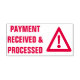 This simple rubber stamp design features the message "PAYMENT RECEIVED & PROCESSED", along with an alert icon symbol. It could be used to mark an invoice or bill as having been paid in full.