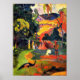 Paysage de Gauguin avec affiche Peacocks. Peinture à l'huile sur toile de 1892. Paul Gauguin est surtout reconnu pour ses célèbres peintures de Tahiti. Matamoe, Or Paysage avec Peacocks est l'une de ses oeuvres les plus aimées. Des paons se promènent au premier plan quand un homme tahitien coupe le bois par un feu. Une hutte se dresse dans l'arrière - plan avec deux femmes qui parlent sous les palmiers tandis que le coucher du soleil transforme le paysage en orange, violet, rouge et jaune. Un grand cadeau pour les amateurs de Paul Gauguin, de paons, de Tahiti, de post-impressionnisme et d'art tropical.