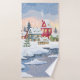 Paysage de Noël d'hiver avec maisons enneigées dans une forêt de pins sur les rives d'une rivière gelée. Illustration des fêtes de Noël.