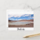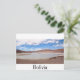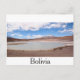Carte postale d'un paysage avec un lac et un volcan enneigé sur l'Altiplano dans les montagnes des Andes dans la zone frontalière entre la Bolivie et le Chili avec une frontière blanche et le tekst : 'Bolivie'.