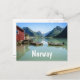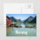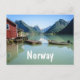 Carte postale d'un paysage avec un bateau et une cabane dans l'eau calme du fjord Fjaerpayfjord avec des montagnes dans l'arrière - plan en Norvège avec le texte : 'Norvège'.