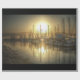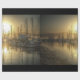 Shows sailboats docked in a harbour just after the sun has risen. The mirror-like surface of the water reflects each boat. HDR processing brings out exquisite detail in the entire scene.