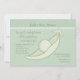 A sweet invitation, in a soft green colour, featuring one pea in a pod. The top border has a baby paisley patter and a white, scalloped trim.