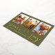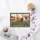 Simple and chic "Peace and Joy" holiday photo card features a collage of 3 portrait photos on a horizontal card layout with white twinkling stars and cute and modern hand-lettered calligraphy script text with heart accent in real gold foil. Personalize the greeting, family signature, and year on the front, and choose to include an additional message on the back of the card. An additional landscape photo space is included on the back. Olive green background color can be modified.
