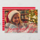 Seasonal photo card features a "Peace and Joy" red colored handwritten calligraphy script overlay design with custom modern serif text that can be personalized with the year and your family / name. The back of the card includes abstract white horizontal stripes with a red colored background.