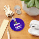 A funky cool personalized keychain with peace and love written in a groovy typography font. The illustration is a hand-shaped peace symbol, fingers raised in the classic v sign all made in rainbow colours. A little doodle heart beside the word love. Psychedelic groovy design. Acid purple background.