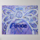 The word for "Peace", is painted in shades lavender with purple, blue, and gold accents. A dove floats above the word peace and there are multiple hearts on the angel. The acrylic painting has a textural contrast and sparkle from a light layer of glitter.