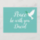 Lovely blue postcard printed with the message Peace be with you in beautiful white script. Alongside this is a flying white dove carrying an olive branch. Personalise by changing the name to suit your requirements (or delete the name if not required).