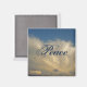 A beautiful blue sky and white cloud photo is featured on this refrigerator magnet and is complimented by the word peace which appears centred in this design. The word "Peace" appears in fancy script text in a dark blue colour. Both the word "Peace" and the font and colour may be customized if you desire.