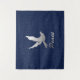 Tapestry in a dove and the word peace in a silver, metallic effect gradient, on a deep blue starry sky background