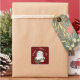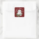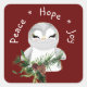 What a year it's been! Holiday sticker that features a watercolor long lashed whimsical penguin with face mask, white "Peace, joy, hope" text and boughs of Christmas evergreens on dark red background.