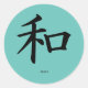 Round sticker features simple Japanese kanji calligraphy symbol for Peace on aqua background