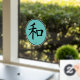 Window cling features simple Japanese kanji calligraphy symbol for Peace on aqua background. Perfect for home, yoga studios, retail businesses and more.