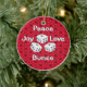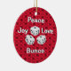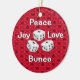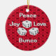 This attractive graphic design will make a great gift for your Bunco friends. Featured in the red, white and black graphic design is the words: Peace, Joy, Love and Bunco. Add your own message or date. Great hostess gift or prize. Also featured are three dice and a floral motif.
