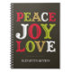Chic, stylish and oh so fashionable! This personalized journal features large text PEACE JOY LOVE in woodcut style typography. Customize this spiral notebook and use it as a diary, a reflection journal, a doodle notebook, idea pad or project planner. This also makes a practical and thoughtful holiday gift.