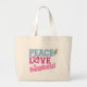 Cool retro-style tote bag. Peace Love and Happiness. Pink and blue peace sign heart symbol and peace hand gesture. Infinite coolness.