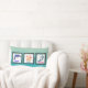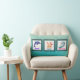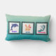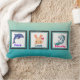 A rectangular lumbar pillow with an aqua green coloured gradient background. The design is a cute graphic with 3 squares and inside each square is a separate cute animal. A blue dolphin jumping with the word "peace". A cute kawaii bunny face and red cheeks holding a heart on a stick with "Love" written underneath. And finally an amusing unicorn tumbling and rolling with glee - the word "insanity" written underneath.