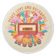 Grunge retro style music illustration with "Peace love and rock & roll" text design and headphones, cassette, flowers, hearts and stars decoration rainbow sun background