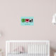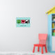 A beautiful teal cat poster print featuring a green peace sign, red heart, and a pretty kitten curled up in a square. Customize this with your own cats names or other text and hang in your bedroom or office.