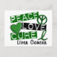 Peace Love Cure Liver Cancer – powerful words to live by and strive for. Share this inspiring sentiment with our Peace Love Cure Liver Cancer t-shirts, merchandise, and gifts featuring hip label text, a peace symbol, heart, and emerald green Liver Cancer support ribbon.