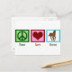 I love beautiful horses. A pretty green peace sign, a red heart, and a brown horse on a blue square makes a cute equestrian postcard to go with a gift.