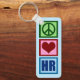 Peace Love HR keychain for a human resources manager. A peace sign, heart, and HR written in blue. Customize with your rep name, business, or company on this cute monogram gift.