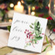 A simple modern double sided holiday card in colours of green and white with a watercolor of a bouquet of holly berries and assorted winter greens and peace love and joy in handwritten script typography. The reverse side has a holiday message and your names which are easily personalized.