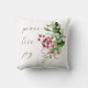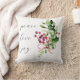 A simple modern Christmas pillow featuring a watercolor of a bouquet of holly berries and assorted winter greens and peace love and joy in handwritten script typography.