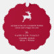 Modern red Christmas holiday greeting card that can also be used as a gift tag and a paper tree ornament. The front features "Peace Love & Joy" in an elegant white serif font. On the back, under an illustration of a reindeer silhouette, add your personalized greeting and names in simple white typography.