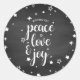 Enjoy this holiday sticker with the words peace love and joy overlaying chalkboard with the decorative stars.