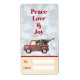 Un étiquette cadeau avec espace pour écrire dans les noms de et de. Conçu avec un design de Noël mignon. Texte : Peace Love & Joy. Image est un petit camion de jouets mignon avec joyeux Noël main peint sur le côté avec des lettres dorées. Portant un sapin de Noël décoré à l'arrière. L'arrière - plan est un motif de livres d'argent.