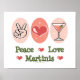 Peace symbol, heart and pink martini with an olive that says Peace Love Martinis on cute cocktail lover t shirts, apparel, stationery and more gifts that celebrate this party drink and alcoholic beverage. This makes a cute girls night out friendship gift, hostess gift or present for a bartender.