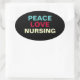 Our Peace Love Nursing Oval Stickers are perfect for Nurses Day or any occasion! Design features text in blue, red and white against dark background. Priced by the sheet with volume discounts available!